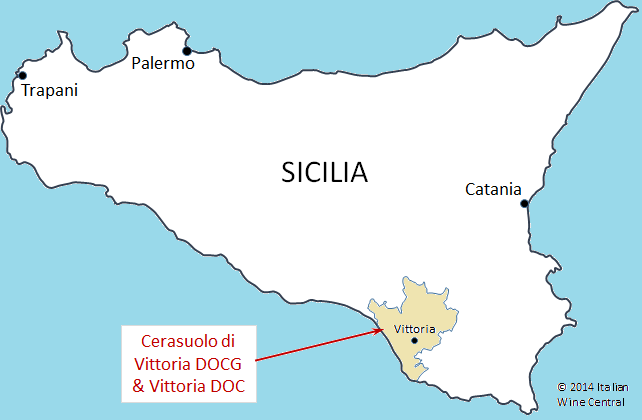 Le Cerasuolo di Vittoria est une appellation d'origine contrôlée et garantie originaire du sud de la Sicile, principalement dans la région de Ragusa et Vittoria. L'appellation fixe les proportions des 2 cépages autorisés, soit le Nero d'Avola entre 50% et 70% et le Frappato entre 30% et 50%.